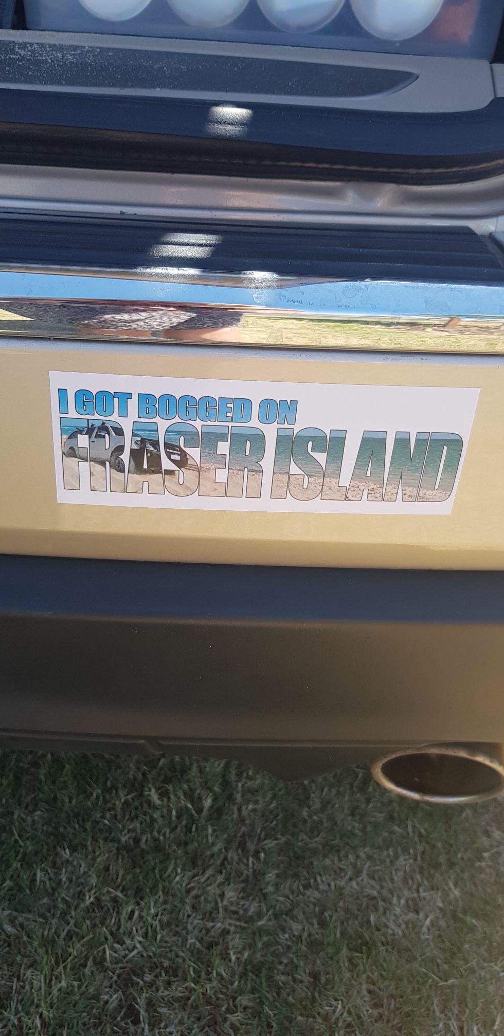 We made it back, where prior to leaving the next day we had to refill the tyres. The Husband refills his, Mr Clarkie commences refilling his tyres and lo and behold, that new gadget thingy for reducing air pressure had not removed any air at all, he had driven the whole Island on full pressure. Men…. you can’t live without em and you can’t kill em when they behave like idiots. I must admit The Husband and I found a car bumper sticker that said ” I got bogged on Fraser Island” we couldn’t help ourselves and added it to Mr Clarkies bumper.