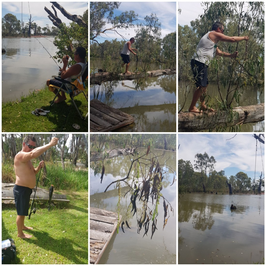 He casts his line, the ultimate fisherman, in the tree it goes only to be rescued by walking out onto the long tree stump over water…oh please fall in…”why are you taking pictures” he demands as I watch him balance… please please fall off. He returns from the branch dangling over the water. I thread my poor drowned sickly looking worm onto the hook, he’s non resistive so I think he’s a bit dead. I cast….into the tree it goes, yep if fish could fly I’d be an expert, The Husband puffs up his chest and commences the gloating.